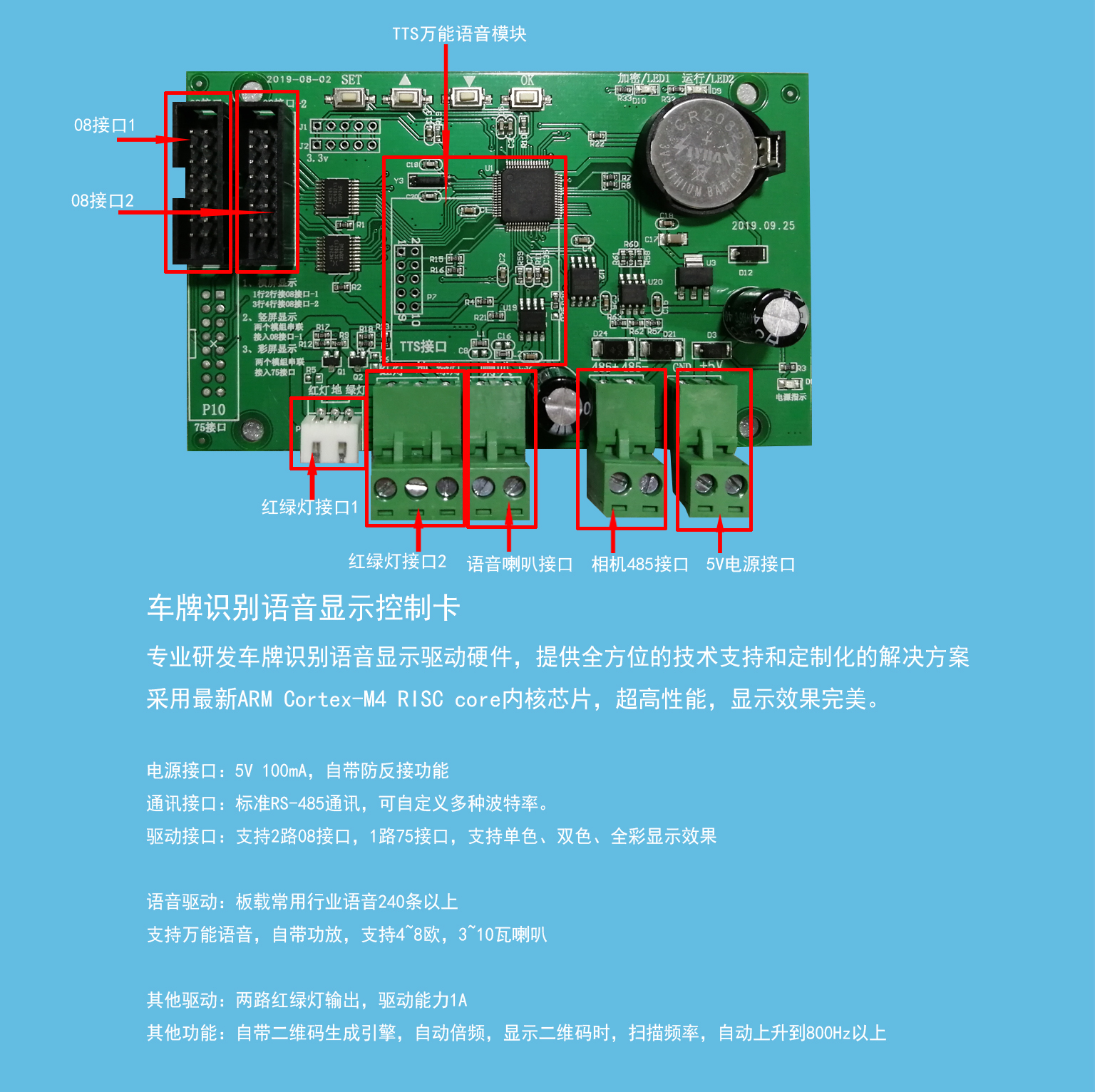 專業(yè)研發(fā)車牌識別語音顯示驅(qū)動硬件,提供全方位的技術(shù)支持和定制化的解決方案采用最新ARM Cortex-M4 RISC core內(nèi)核芯片,超高性能,顯示效果完美。 電源接口:5V 100mA,自帶防反接功能通訊接口:標準RS-485通訊,可自定義多種波特率。驅(qū)動接口:支持2路08接口,1路75接口支持單色、雙色、全彩顯示效果語音驅(qū)動:板載常用行業(yè)語音240條以上支持萬能語音自帶功放,支持4~8歐,3
